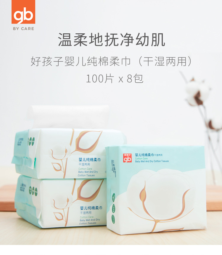 gb好孩子 婴儿湿巾 干湿两用纯棉柔巾 100片*8包